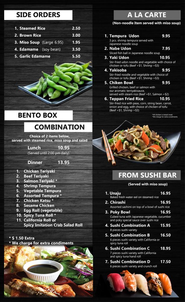 The menu offerings don’t stop at sushi; the appetizers are equally tempting, featuring crisp Vegetable Tempura and savory Crab Cheese Wontons. For those seeking variety, the bento boxes are packed with value and flavor, making them perfect for lunch or dinner. Customers rave about the freshness and quality of the fish, with many returning for the spot's vibrant rolls, creative combinations, and friendly service.